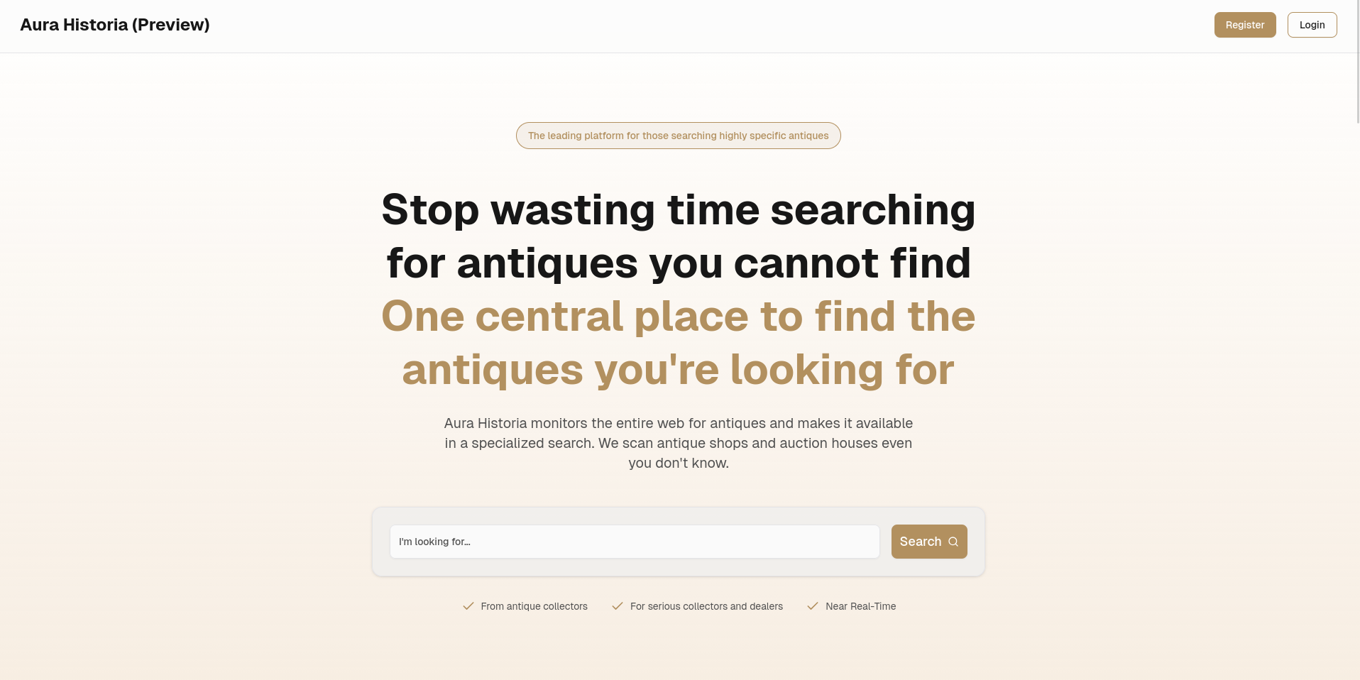 Aura Historia monitors the entire web for antiques and makes it available in a specialized search. We scan antique shops and auction houses even you don't know. Aura Historia searches through the vast offerings of thousands of scattered antique dealers, auction houses and marketplaces worldwide and bundles their items in one central place. We not only capture current and upcoming items but also track price changes and availability. This way, you never miss a bargain and always keep an eye on the market. Create search-requests and get notified whenever an antique item of interest for you turn
